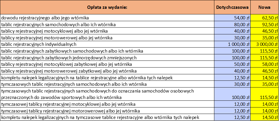 W związku z powyższym w nowelizowanym rozporządzeniu zaproponowano jednorazowe podniesienie wysokość opłat administracyjnych za wydanie dowodu rejestracyjnego, pozwolenia czasowego oraz ich wtórników, a także zalegalizowanych tablic (tablicy) rejestracyjnych o 11,4% a następnie 3,6%, tj.: o wskaźnik wzrostu cen towarów i usług konsumpcyjnych za lata: 2023 r. i 2024 r. Powyższe skutkuje skumulowanym podniesieniem wysokości opłat o 15,41%, z uwzględnieniem zasady ich zaokrąglenia w górę do 0,50 złotego albo do złotego.